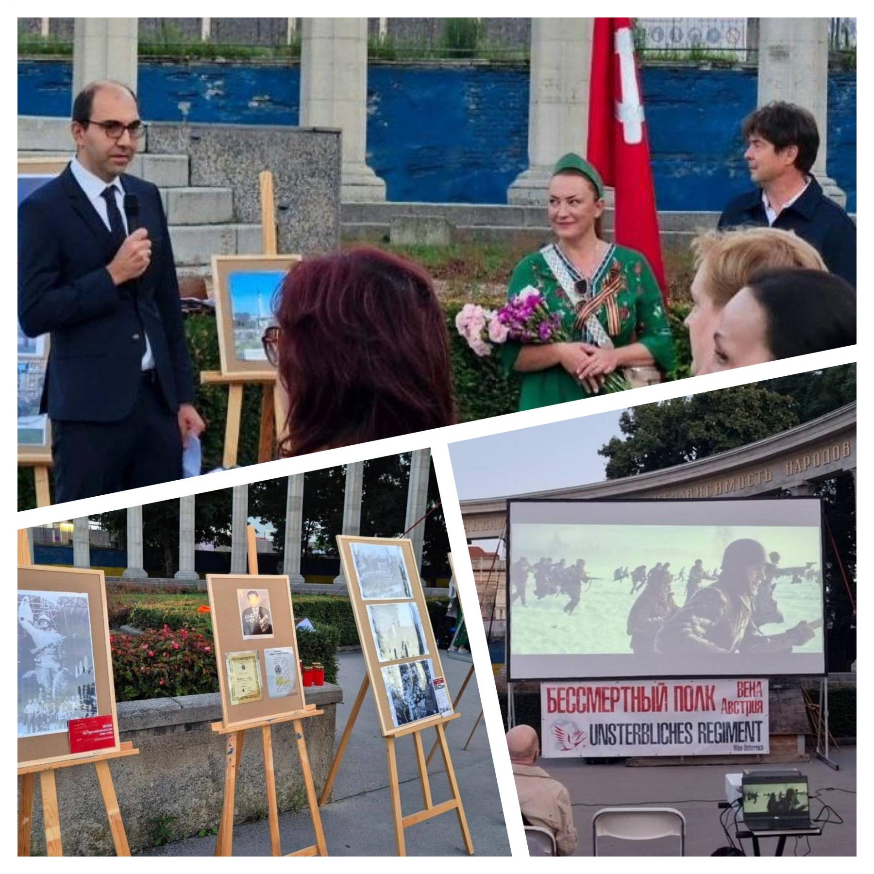 В центре Вены, на площади Шварценбергплац у памятника героям Советской Армии, Международный Бессмертный Полк провёл уличный показ военной драмы «Ржев». Акция была приурочена сразу к нескольким памятным датам: 80-летию окончания Второй мировой войны, 80-летию открытия монумента 19 августа 1945 года, а также Международному дню памяти жертв фашизма. Перед началом показа зрители смогли увидеть выставку архивных фотографий, запечатлевших открытие памятника в послевоенной Вене. Материалы для экспозиции предоставил Музей освобождения Вены. В мемориальной части мероприятия с приветственным словом выступил представитель Посольства России в Австрии. К возложению цветов у подножия памятника присоединились байкеры из мотоклуба «Ночные Волки Австрия» и их партнёры из Словакии. Фильм был предоставлен Общероссийским общественным гражданско-патриотическим движением «Бессмертный полк России» с согласия правообладателя Кинокомпании «Триикс Медиа». Организационную помощь в проведении акции оказала «Австрийская ассоциация евразийского сотрудничества». Стоит добавить, что кинопоказ прошел не без активного противодействия со стороны украинских националистов, организовавших акцию протеста, против показа российского фильма. Тем не менее австрийская полиция обеспечила порядок и безопасность всех, кто пришел на мероприятие. Показ кинофильма прошёл без срывов. Несмотря на сопротивление, вечер на Шварценбергплац стал важным напоминанием о цене победы и о необходимости беречь историческую память.