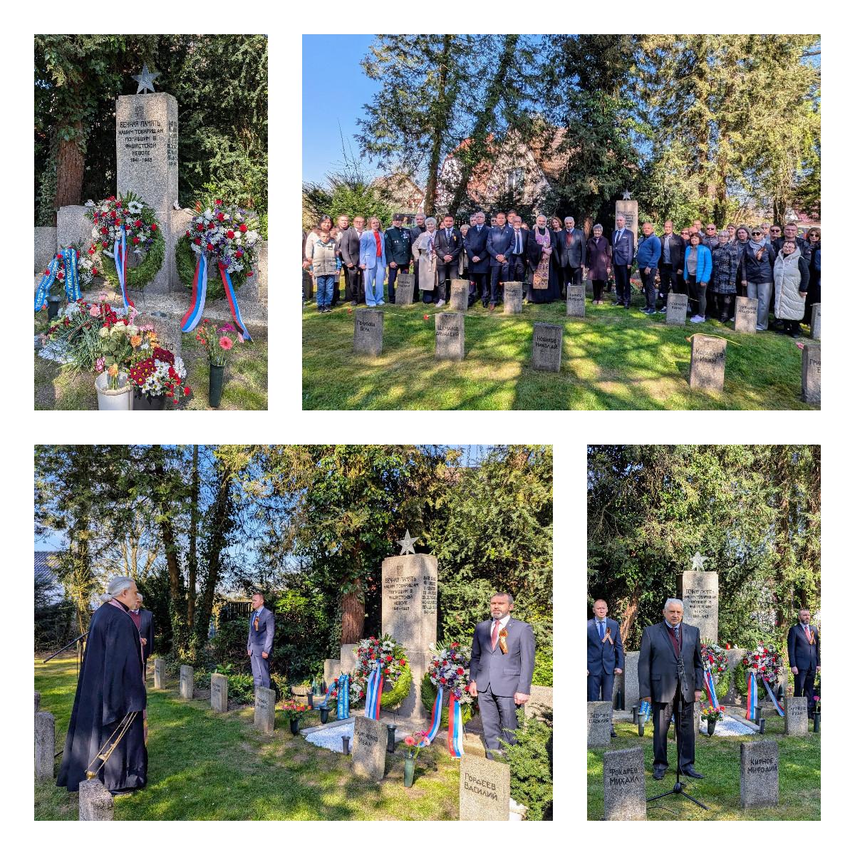 На советском мемориале на Северном кладбище города Зигбурга состоялось мемориальное мероприятие, приуроченное к празднованию 80-ой годовщины Победы советского народа в Великой Отечественной войне и освобождения города от нацизма в 1945 году. В этом месте покоится несколько сотен советских военнопленных, погибших в трудовых лагерях, под бомбардировками и артиллерийскими обстрелами. В мероприятии приняли участие: Посол России в Германии С.Нечаев, Генконсул России в Бонне О.Красницкий, руководитель отделения Посольства Казахстана в Бонне У.Абдыбеков, представители объединений и организаций русскоязычных соотечественников западных регионов ФРГ, приходов Русской православной церкви и немецкой общественности, волонтёры и активисты, занимающиеся военно-мемориальной работой в Германии. В начале церемонии настоятель храма Покрова Пресвятой Богородицы Русской Православной Церкви в городе Дюссельдорфе иерей Михаил провёл панихиду в память о погибших. Об истории мемориала участникам рассказала Г.Блюменфельд, супруга покойного В.Блюменфельда, который на протяжении многих лет вёл работу по восстановлению комплекса и установлению имен покоящихся в этом месте советских граждан. Сегодня она вместе с другими активистами из города Зигбурга и окрестностей постоянно ухаживает за захоронением. В своём обращении Посол России выразил благодарность участникам мероприятия за стремление к сохранению за рубежом памяти о Великой Отечественной войне, а также за уход за нашими военными захоронениями и мемориалами. Российский дипломат особо подчеркнул недопустимость разделения советских жертв нацистской агрессии по национальному признаку. В завершение мероприятия к мемориалу были возложены венки и цветы.