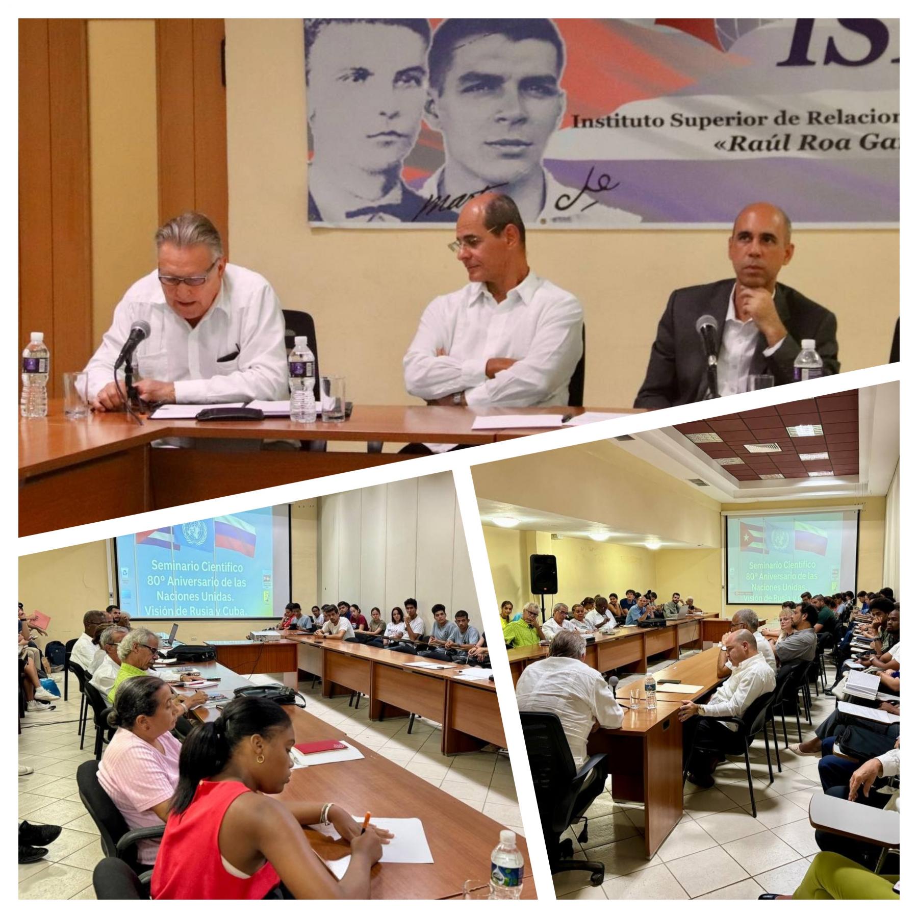 В Гаване состоялся экспертно-научный семинар, организованный Высшим институтом международных отношений имени Рауля Роа Гарсии (ISRI) совместно с Посольством России на Кубе. В ходе мероприятия проведен обстоятельный ретроспективный анализ вклада России и Кубы в создание ООН, а также нынешнего состояния Организации в свете стоящих перед ней задач и вызовов. После приветственных слов ректора ISRI Р.Сьерры Диаса перед участниками семинара – преподавателями и студентами учебного заведения – выступили Посол России на Кубе В.Коронелли, директор Управления международного права МИД Кубы Ю.Ромеро Пуэнтес, профессор Э.Лима Меса и сотрудник архива МИД Кубы А.Альба Эрнандес.