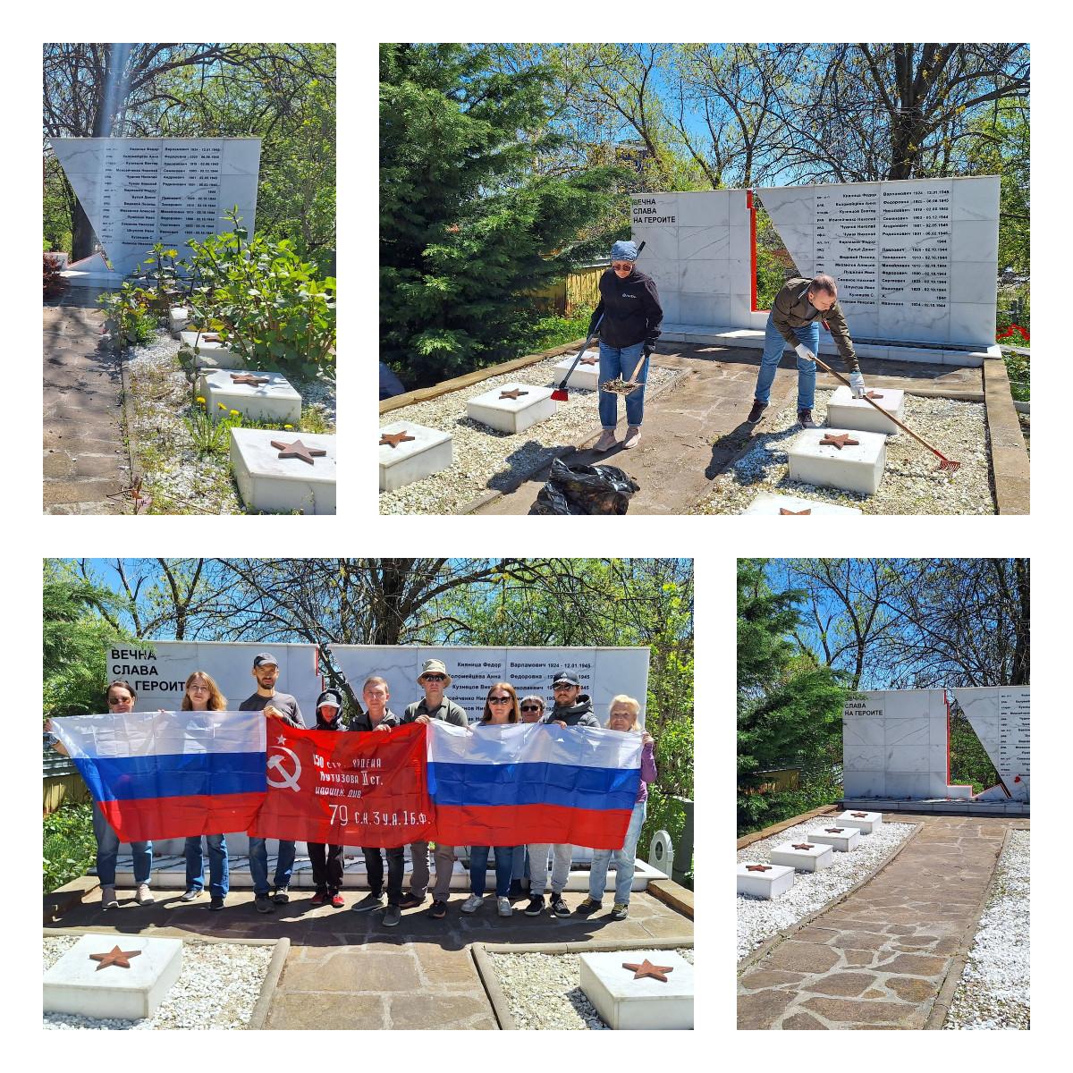 На советском воинском захоронении в квартале «Княжево» в Софии состоялся традиционный субботник. Российские соотечественники и сотрудники РЗУ привели в порядок участок, где похоронены 15 советских военнослужащих: почистили могилы от травы, обновили краску, заменили щебенку. Ежегодная уборка территории вокруг памятников и захоронений времен Великой Отечественной войны - важная часть работы по сохранению правды о подвиге наших предков, отдавших жизни в борьбе с фашизмом. В этом году акция также приурочена ко Всероссийской неделе субботников «Мы за чистоту», стартовавшей 18 апреля. Инициированная «Росмолодёжью» и движением «Экосистема» кампания объединит свыше 2000 событий в регионах России и за её пределами: от расчистки лесных массивов и береговых линий до наведения порядка у памятников истории и культуры.