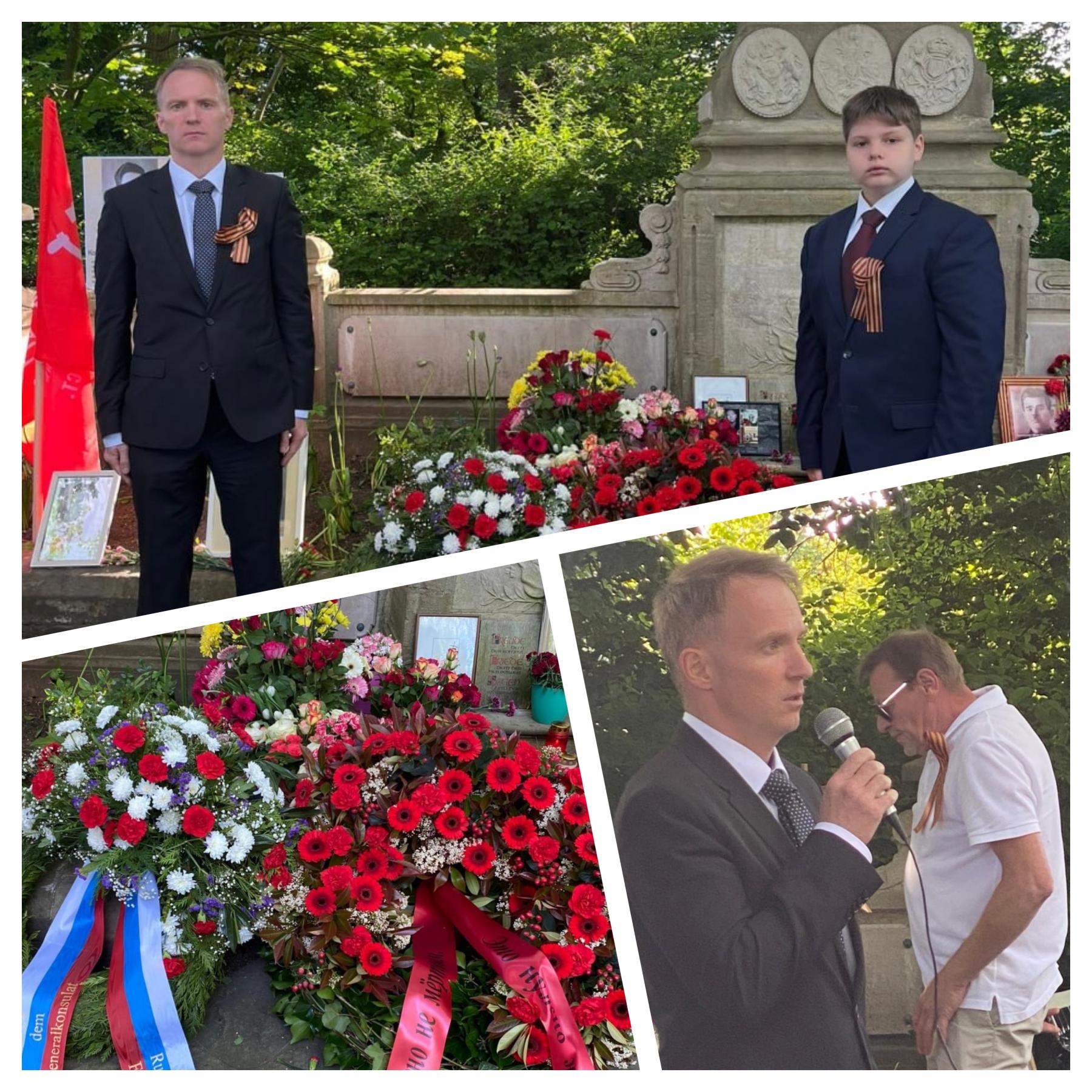 На военном мемориальном кладбище Мюнстера состоялась торжественная церемония возложения венков к мемориалу советских военнопленных, погибших на принудительных работах в близлежащих трудовых лагерях. Здесь также захоронены российские воины, павшие на фронтах Первой мировой войны. С благодарственным словом перед собравшимися выступил консул М.Ктиторов, поздравивший всех с великим и священным праздником Победы!  Среди около 200 присутствующих были представители объединений русскоязычных соотечественников, движения антифашистов Германии. В завершение мероприятия настоятель храма Иконы Казанской Божьей Матери отслужил панихиду по всем невинно убиенным.