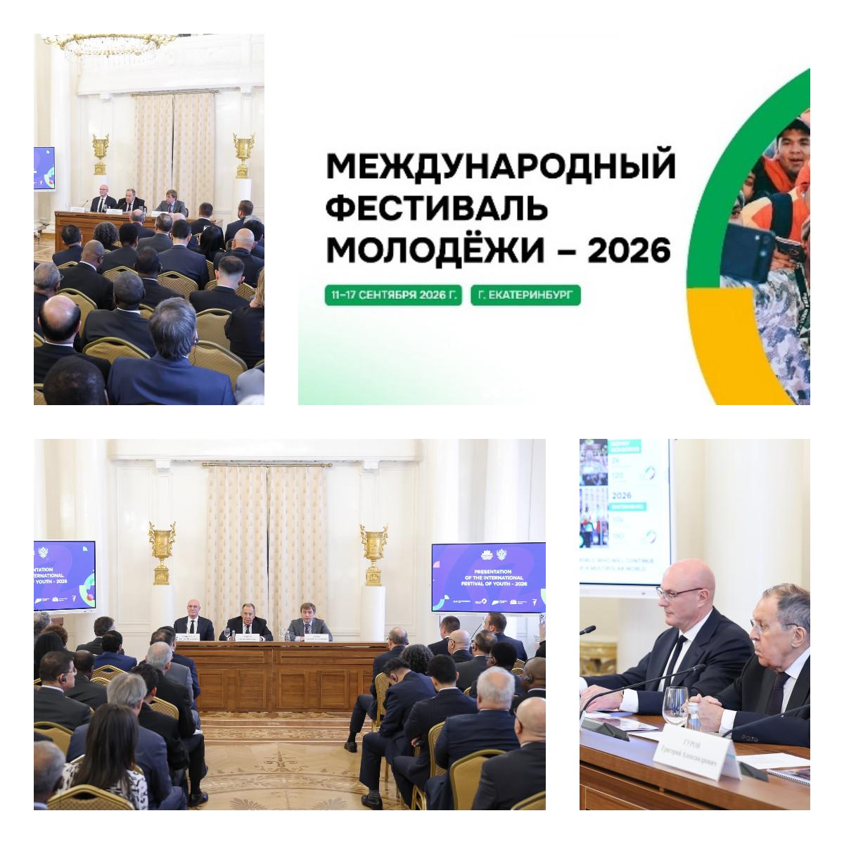 В Доме приёмов МИД России прошла презентация крупнейшего международного молодёжного события в 2026 году – «Международного фестиваля молодёжи» (#МФМ2026). С приветственными словами к представителям дипломатического корпуса, партнёрам Фестиваля, российским и зарубежным СМИ обратились Заместитель Председателя Правительства Российской Федерации Дмитрий Чернышенко и Министр иностранных дел Российской Федерации Сергей Лавров. С презентацией Фестиваля выступил руководитель Федерального агентства по делам молодёжи Григорий Гуров, который представил программу мероприятий и её ценностные принципы, а также рассказал о процедурах конкурсного отбора участников. Фестиваль пройдёт в Екатеринбурге с 11 по 17 сентября 2026 года и примет 10 000 российских и иностранных молодых людей из более чем 180 стран мира, включая детей в возрасте от 14 до 17 лет. В рамках региональной программы Фестиваля участники посетят тридцать субъектов Российской Федерации, а также Республику Абхазия.