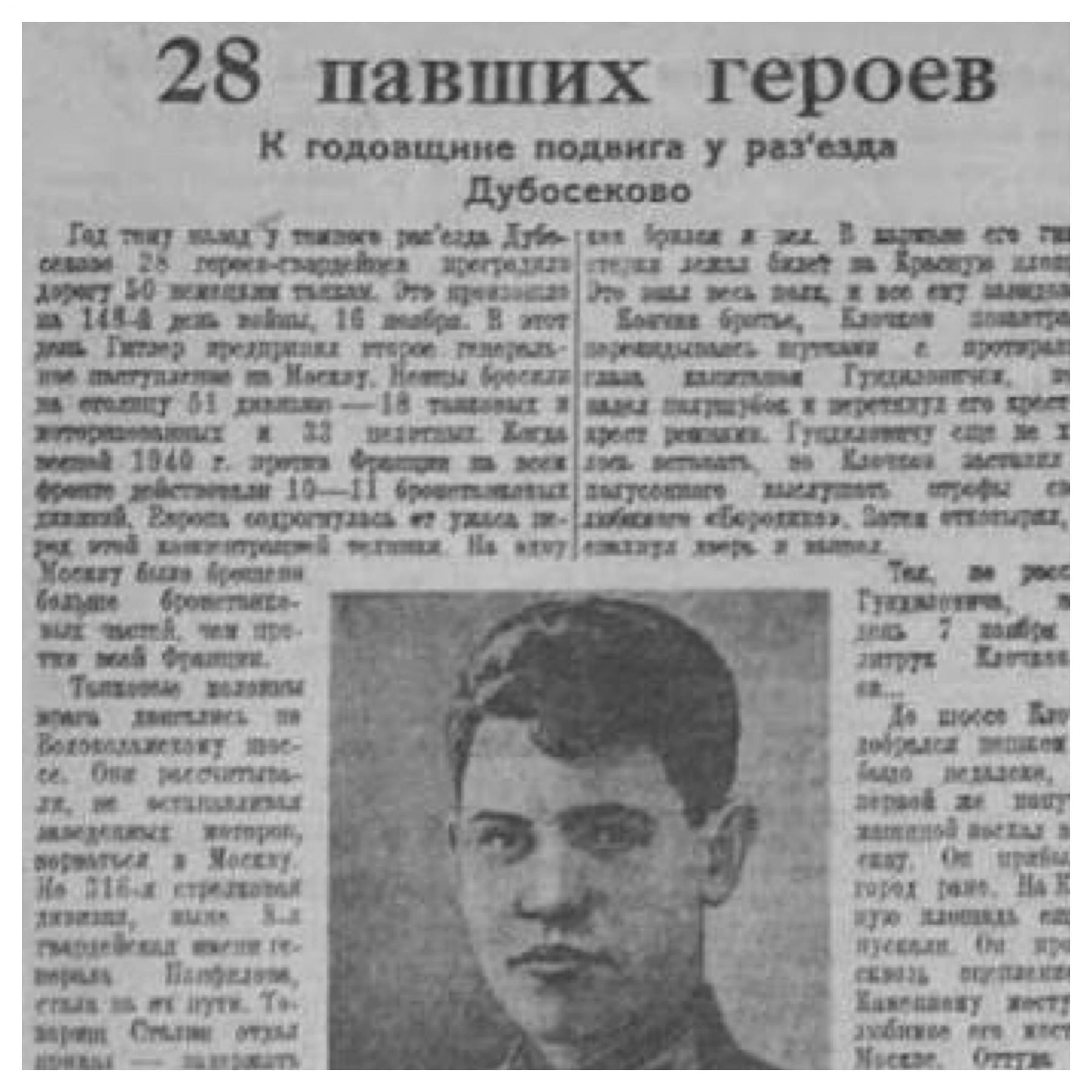Фронт обороны панфиловцев под Волоколамском растянулся на 41 (!) километр. После мощной авиационной и артиллерийской подготовки нацисты подвергли ожесточённой атаке позиции 4-й роты во главе с политруком Василием Клочковым. 16 ноября 1941 года гитлеровцы перешли в контрнаступление. Советские бойцы, понимая, что отступать некуда, позади — Москва, стойко сражались, отражая одну за другой танковые атаки врага, сдерживая наступление превосходящих сил вермахта в течение четырёх часов неравного боя. К моменту решающего боя у панфиловцев почти не осталось средств противотанковой обороны. Так, 1075-й стрелковый полк, оборонявшийся на наиболее уязвимом для немецкой бронетехники направлении, располагал всего двумя 76-мм орудиями и четырьмя противотанковыми ружьями. Бойцы были вынуждены отбивать танковые атаки фашистов в основном с помощью гранат и бутылок с зажигательной смесью. В день сражения 16 ноября 1941 года врагу был нанесён значительный урон в живой силе и технике. Панфиловцы отразили несколько атак противника и сожгли восемнадцать танков. Большинство бойцов, в том числе и политрук Клочков, пали смертью храбрых. Несколько человек были тяжело ранены. Этот бой вошёл в историю как подвиг 28 панфиловцев. Уже 18 ноября 1941 года 316-я дивизия была переименована в 8-ю гвардейскую и награждена орденом Красного Знамени. В тот день погиб в бою и командир дивизии Иван Панфилов. Постановлением Государственного комитета обороны от 23 ноября 1941 года возглавляемому легендарным военачальником соединению было присвоено наименование в честь полководца — Панфиловская. Бесстрашные панфиловцы вместе с другими соединениями Западного фронта с честью и достоинством выполнили поставленную задачу — не позволить врагу выйти к Москве. Благодаря Подвигу панфиловцев и их самопожертвованию было выиграно время, необходимое для организации обороны столицы от фашистских захватчиков. На месте боя, к его 30-летию, в 1975 году был воздвигнут мемориальный ансамбль из гранита «Подвигу 28» или «Героям-панфиловцам», состоящий из шести монументальных фигур, олицетворяющих солдат шести национальностей, сражавшихся в рядах дивизии. В том же 1975 году в городе Алма-Ате был воздвигнут Мемориал Славы в Парке имени 28 гвардейцев-панфиловцев. В память о легендарном и бессмертном Подвиге красноармейцев у Мемориала горит Вечный Огонь. В годы Великой Отечественной войны свыше 14 000 красноармейцев 316-й дивизии были награждены орденами и медалями. Подвиги 33 офицеров и солдат отмечены высоким званием Героя Советского Союза.