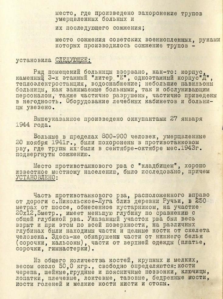 «В результате такого варварского отношения к больным среди них началась большая смертность и к ноябрю месяцу 1941 года умерло около 200 человек. Не останавливаясь на этом, немецко-фашистские захватчики решили душевнобольных уничтожить путём отравления. По оценке судмедэксперта Владимирского, которую он высказал на основании клинической картины, восстановленной по показаниям подследственных, их жертвы могли быть отравлены комбинированным препаратом на основе морфина и солей тяжёлых металлов. После уколов у больных быстро наступало сонливое состояние, у некоторых наблюдались судороги и в течение не более трёх часов наступала смерть. Двум медсёстрам больницы, Ядвиге Ракович и Эмилии Поляковой, суд назначил наказание в виде десяти лет исправительно-трудовых лагерей с поражением в политических правах на пять лет и конфискацией имущества, остальные обвиняемые – врачи-ординаторы больницы Людмила Степанова и Фелиция Горлицина, санитар Владимир Татищев, помощник завхоза Пётр Петров, смотритель зданий больницы Владимир Кудряшов и изменивший присяге красноармеец, местный уроженец Пётр Богомолов, – были приговорены к расстрелу, также с конфискацией имущества.