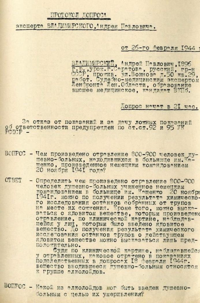 ФСБ России публикует рассекреченные документы из уголовного дела о расправе немецкой оккупационной администрации над более чем 800 пациентами психиатрической больницы имени Петра Кащенко в Гатчинском районе в ноябре 1941 года. Среди публикуемых документов – выписки из актов о злодеяниях немецко-фашистских захватчиков в Гатчинском районе, копия приговора Военного трибунала Ленинградского фронта от 9 апреля 1944 года в отношении фигурантов дела, протокол допроса главного судмедэксперта Ленинградского фронта Андрея Владимирского, а также акт судебно-медицинской экспертизы, датируемый 20-22 февраля 1944 года.