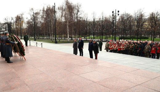 Венок и живые цветы к Вечному огню на Могиле Неизвестного Солдата у Кремлевской стены вместе с однополчанами возложил член Президиума Академии Нюрнбергских принципов, заместитель директора Института государства и права Российской академии наук (ИГП РАН), писатель и историк Александр Звягинцев: