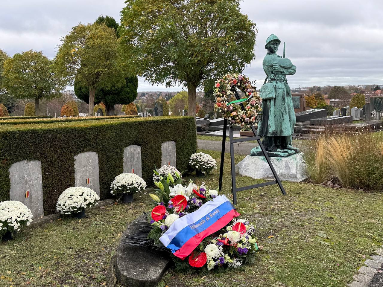 В день 107-й годовщины окончания Первой мировой войны, на кладбище брюссельской коммуны Иксель состоялась церемония возложения венков к могилам тринадцати русских солдат, являющимся частью воинского мемориала стран-союзниц. В мероприятии приняли участие Посол России в Бельгии Д.Гончар, сотрудники Посольства, «Русского Дома» в Брюсселе, священнослужители Брюссельско-Бельгийской Архиепископии, проживающие в Бельгии соотечественники, включая активистов движения «Бессмертный полк» и потомков эмигрантов «первой волны», а также представители бельгийской общественности. Была отслужена заупокойная лития по павшим воинам. Посол в своем выступлении напомнил о союзнических отношениях между Российской империей и Бельгией в период Первой мировой войны и подчеркнул значительный вклад нашей страны в восстановление мира в Европе.