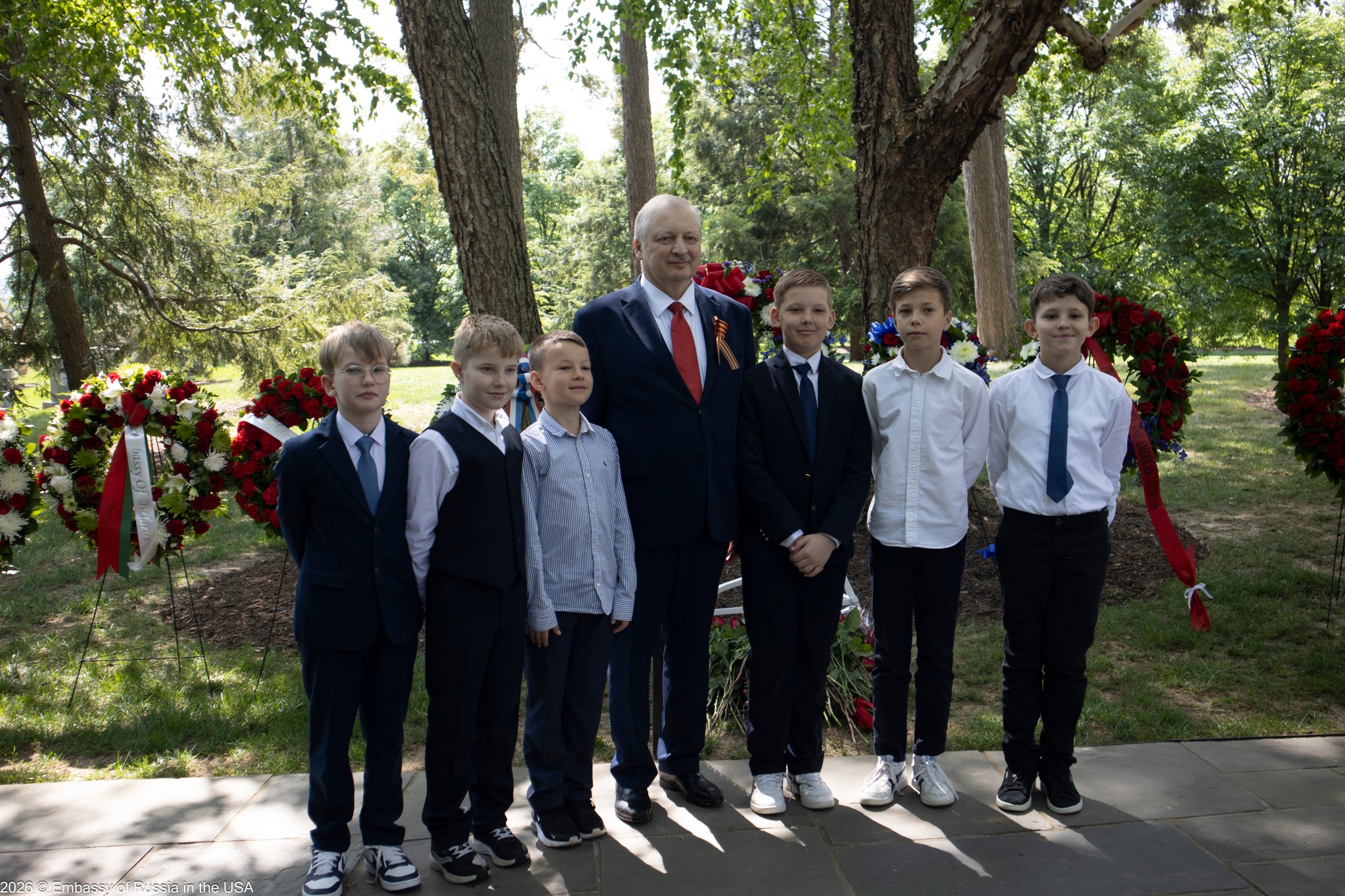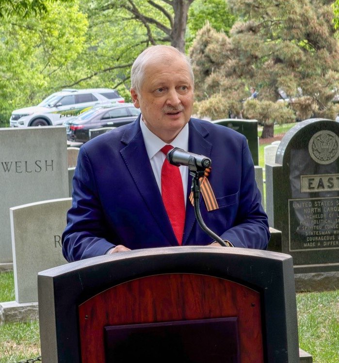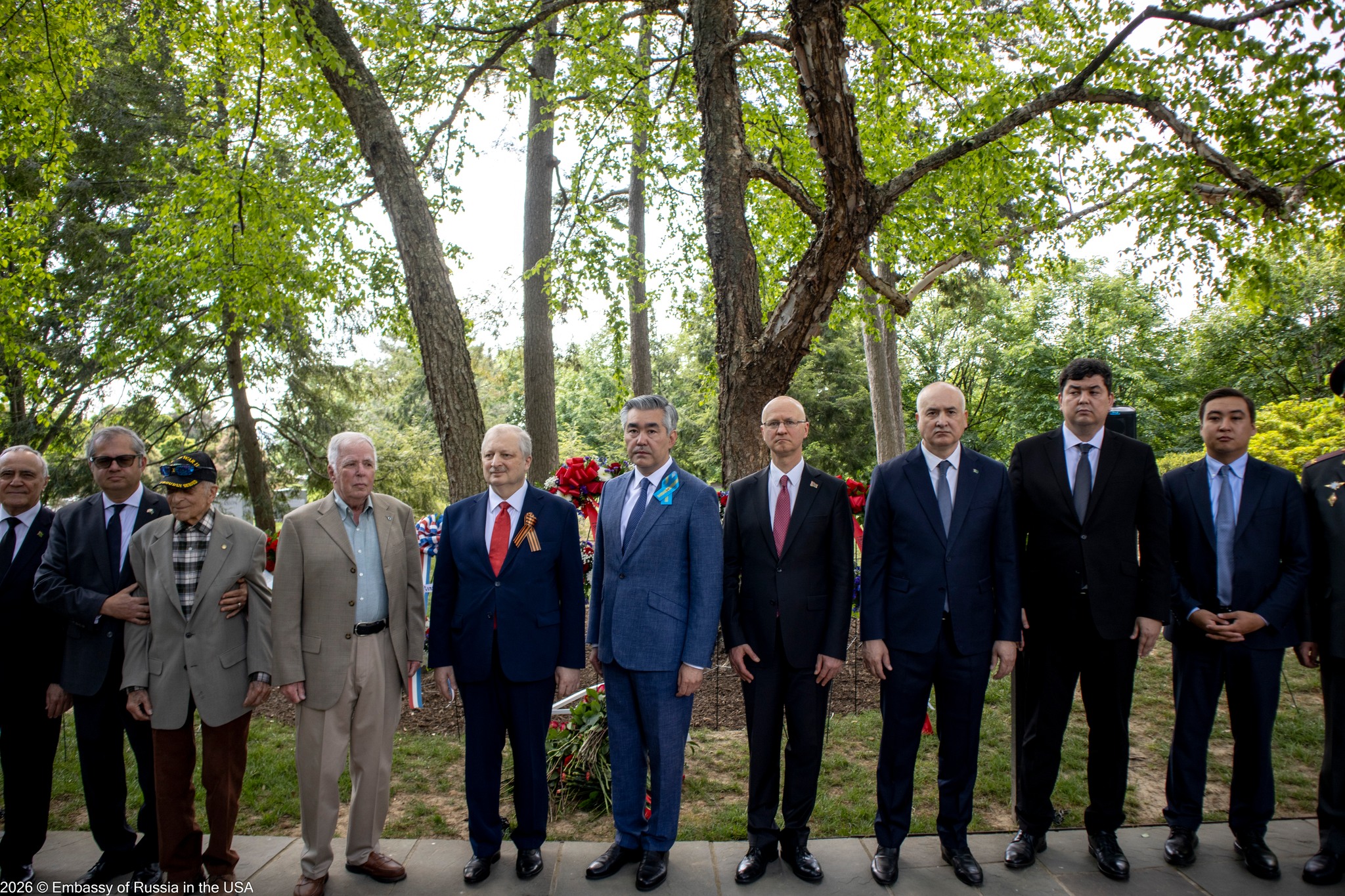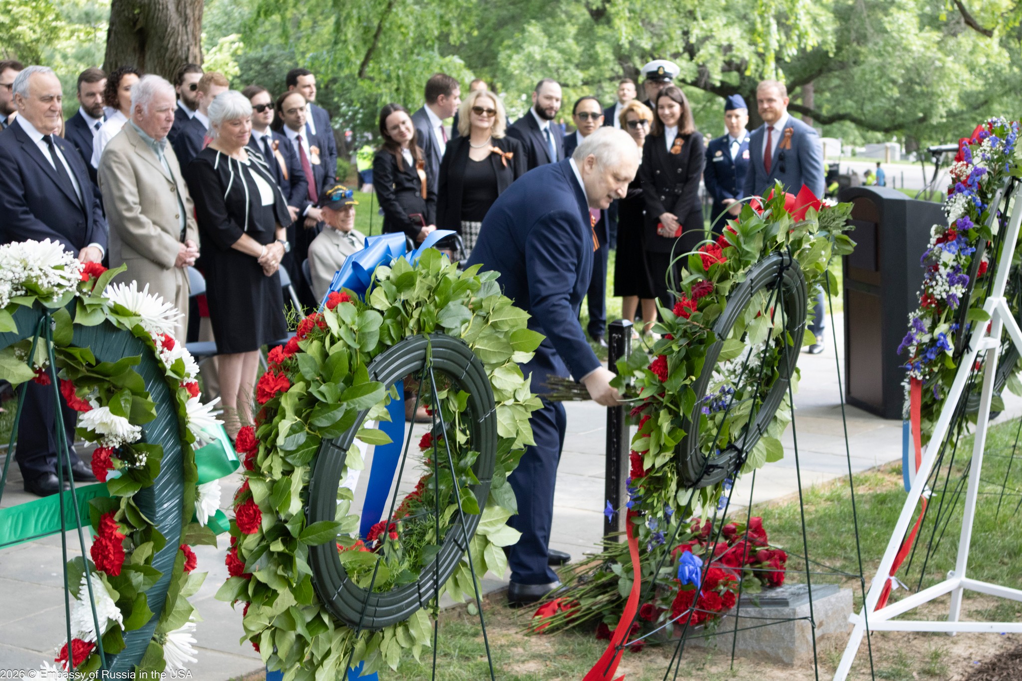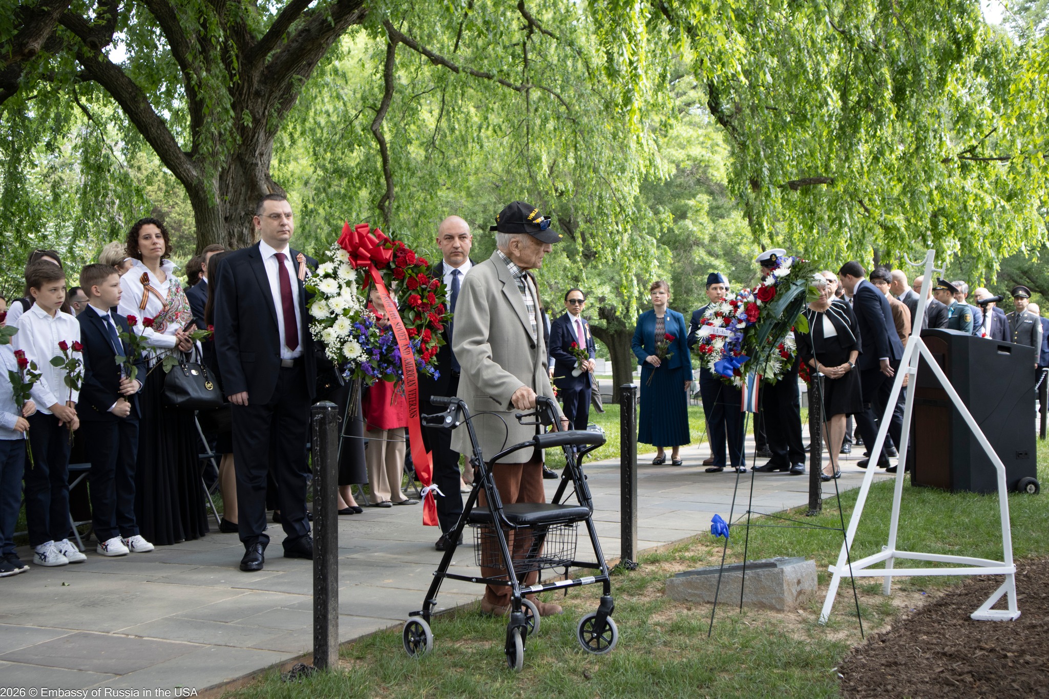 «Сегодня, по давно сложившейся традиции, которая, к сожалению, прервалась не по нашей вине в 2022 году, но с приходом к власти нынешней администрации США возобновилась в прошлом году, мы собрались на Арлингтонском кладбище у мемориала «Дух Эльбы». Встреча на Эльбе имела не только стратегическое, но и морально-психологическое значение, символизируя боевое братство двух стран, которые отбросили разногласия и объединились ради разгрома «абсолютного зла - германского нацизма».