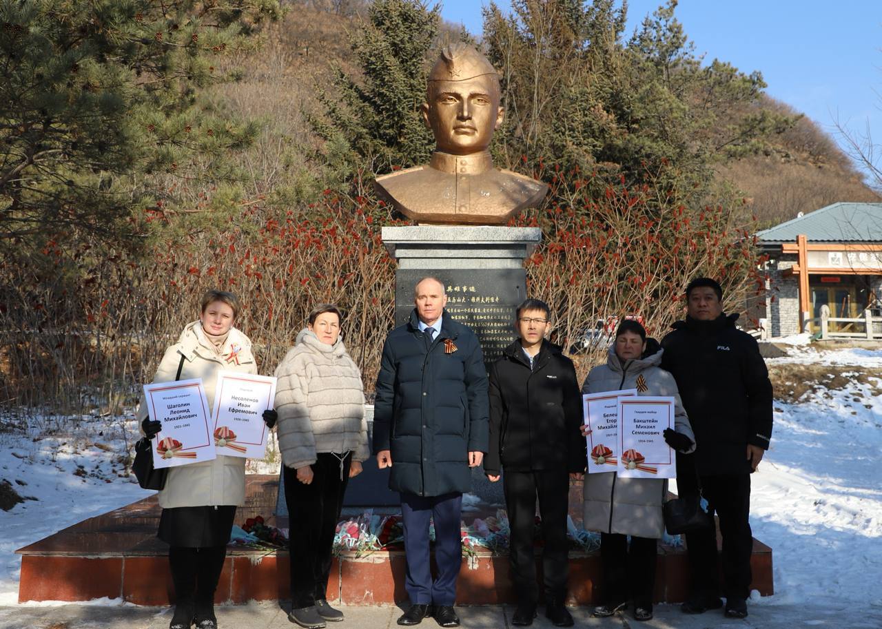 В Китае на территории музея Дуннинского укрепрайона (в провинции Хэйлунцзян) прошло памятное мероприятие, посвященное Дню Героев Отечества. Участники церемонии возложили цветы к памятнику Герою Советского Союза младшему сержанту Александру Фирсову, почтили память павшего Героя минутой молчания. Младший сержант Александр Фирсов был удостоен высокого звания Героя Советского Союза посмертно за подвиг, который он совершил 11 августа 1945 года. В этот день 567-й стрелковый полк 384-й стрелковой дивизии 25-й армии 1-го Дальневосточного фронта, в котором служил младший сержант Фирсов, штурмовал одну из высот Дуннинского укрепрайона. Японские смертники отчаянно защищались. В разгар боя Александр Фирсов подтащил свой пулемет ближе к ДОТу противника. В ожесточенной перестрелке он был ранен. Японский пулемет на время умолк, но, когда советские солдаты поднялись в атаку, заговорил снова. Александр Фирсов был ближе всех к ДОТу, но свой боезапас он уже израсходовал. Собрав последние силы, он бросился к амбразуре и закрыл ее своей грудью. Когда рота штурмом овладела рубежом, все увидели неподвижно лежавшего на вражеской амбразуре Александра Фирсова. Пожертвовав жизнью, он спас от смерти многих своих товарищей и обеспечил выполнение боевой задачи. У памятника Герою была проведена акция «Горсть земли»: педагоги и ученики Покровской средней школы привезли с собой землю, собранную на мемориале в селе Полтавка Октябрьского района Приморского края, где похоронен Александр Яковлевич. Они также собрали землю у памятника в Дуннине, которая будет передана на малую родину Героя в Рязанскую область его родственникам. Работа по поиску родственников Александра Фирсова была проведена волонтерами международного проекта «Вахта памяти. Порт-Артур». Участники мероприятия также возложили цветы к мемориалу советским воинам, павшим при взятии японского укрепрайона Дуннин, и к братскому захоронению у поселка Саньчакоу уезда Дуннин. Героями Советского Союза стали 93 воина — участника наступательной операции советских войск по освобождению Северо-востока Китая от японских милитаристов в августе-сентябре 1945 года, шестеро из них получили Золотую Звезду Героя во второй раз, одиннадцать — повторили подвиг Александра Матросова, закрыв собой амбразуры японских дотов. День Героев Отечества — еще один повод выразить благодарность нашим предкам и современникам, которые проявили беззаветную преданность Родине, в разные исторические периоды, не щадя себя, боролись за независимость нашей Родины, помогали другим народам в защите и освобождении своих стран от агрессоров. В мероприятии приняли участие советник Посольства России в Китае, руководитель представительства Министерства обороны Российской Федерации по организации и ведению военно-мемориальной работы в КНР Андрей Кисенко, руководство Народного правительства уезда Дуннин, делегация из Приморского края во главе с заместителем главы администрации Октябрьского муниципального округа Светланой Данилиной, включая педагогов и учащихся Покровской средней общеобразовательной школы, ученики Дуннинской общеобразовательной школы, волонтеры международного проекта «Вахта памяти. Порт-Артур», жители города Дуннин.