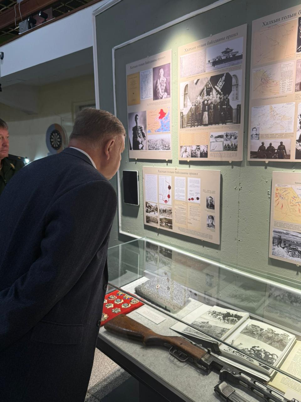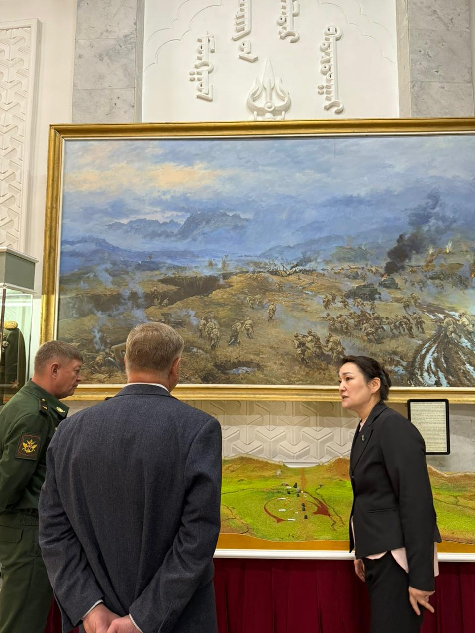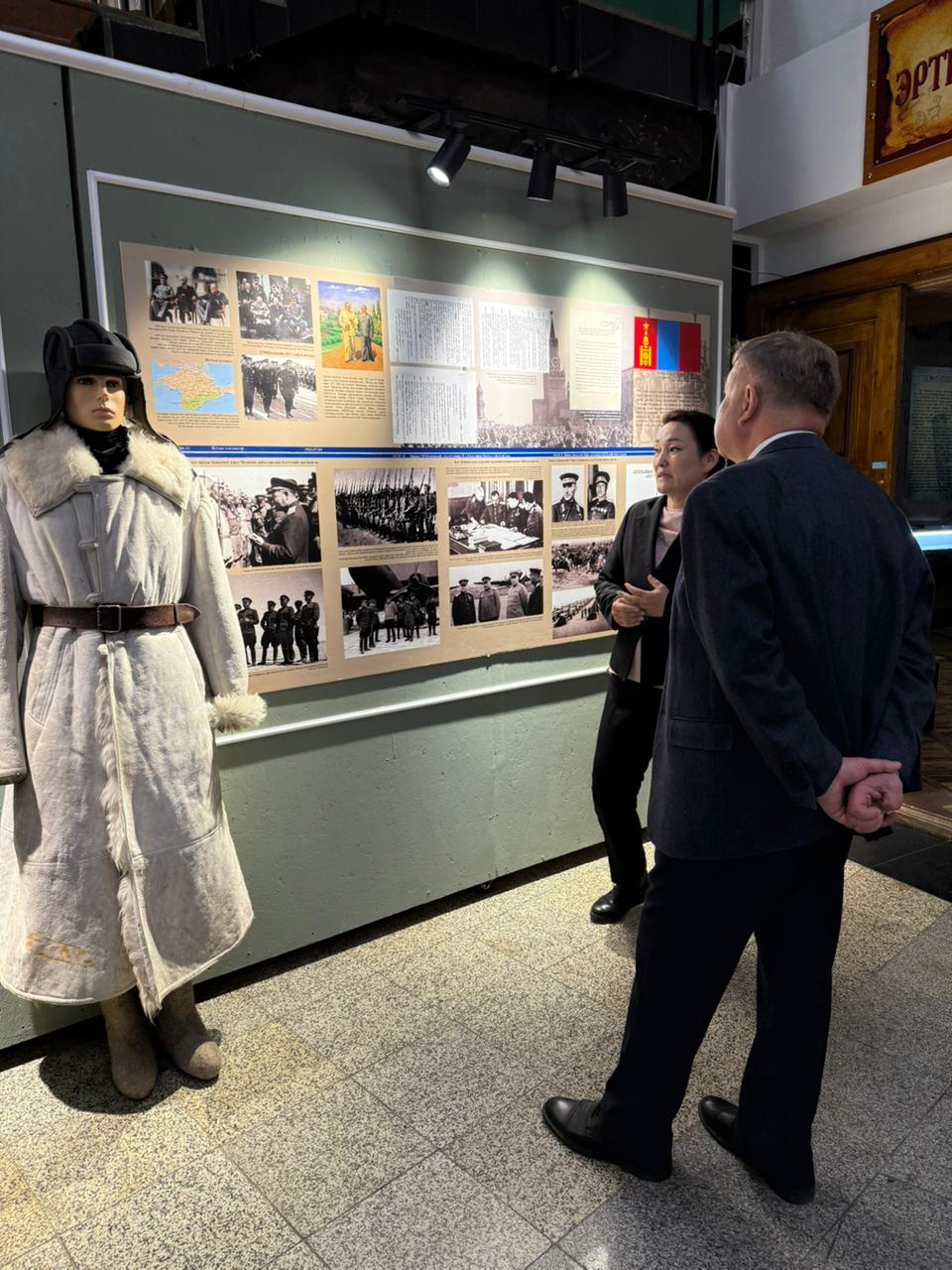 Сотрудники Посольства России в Монголии во главе с Чрезвычайным и Полномочным Послом А.Евсиковым и Военным и военно-воздушным атташе генерал-майором П.Петруниным по приглашению Министерства обороны Монголии посетили расположенный в Улан-Баторе Музей монгольского воинства. В ходе экскурсии директор Музея Маршала Советского Союза Георгия Жукова подполковник Д.Амартайван представила почетным гостям экспозицию, включающую многочисленные документы и карты, отдельные образцы вооружения, форм и мундиров 1930-1940-х годов, реконструкцию военного госпиталя времен Маньчжурской стратегической наступательной операции 1945 года, а также оригиналы знамен монгольских воинских формирований, принимавших участие в вооруженных конфликтах времен Второй мировой войны. В рамках мероприятия состоялась встреча с представителями Монгольской ассоциации полковников, в ходе которой был обсужден план совместного празднования в следующем году таких юбилеев, как 105-я годовщина установления дипломатических отношений между Россией и Монголией, 130-летие со дня рождения четырежды Героя Советского Союза, Героя МНР Георгия Жукова и 90-летие со дня подписания советско-монгольского Протокола о взаимной помощи. Отдельно рассмотрены вопросы подготовки мемориальной акции, посвященной монгольскому верблюжьему каравану, который в годы Великой Отечественной войны доставил материальную помощь монгольского народа советским братьям из монгольского Кобдо (Ховд) до города Бийск Алтайского края.