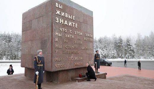 Президент Российской Федерации Владимир Путин принял участие в памятных мероприятиях, посвящённых 82-й годовщине полного освобождения Ленинграда от фашистской блокады. Президент посетил мемориальный военно-исторический комплекс «Невский пятачок» в Ленинградской области, где возложил цветы к памятнику «Рубежный камень». «Невский пятачок» - небольшой плацдарм на левом берегу Невы, где с первых дней блокады советские бойцы сдерживали натиск численно превосходящих сил врага, не давая ему приблизиться к Ленинграду. В 1971 году здесь, на месте ожесточённых боёв, в память о защитниках Родины, погибших на Невском пятачке, был открыт монумент «Рубежный камень». На памятнике выложены строки поэта Роберта Рождественского: